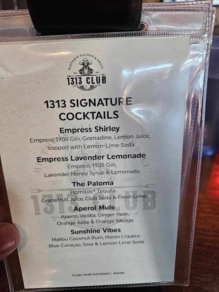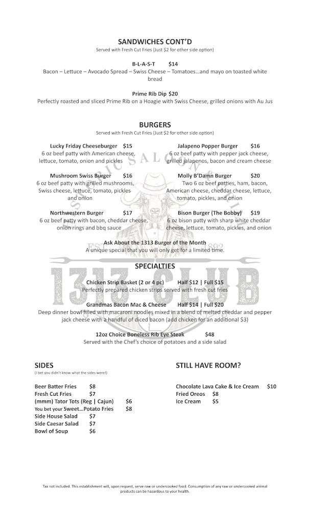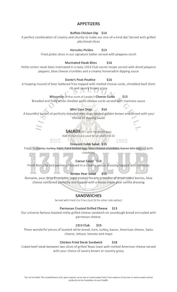The menu at 1313 Club caters to a variety of tastes. Appetizers range from Buffalo Chicken Dip to Dante's Peak Poutine. Salads and sandwiches satisfy lighter appetites. Each dish reflects traditional American comfort food.