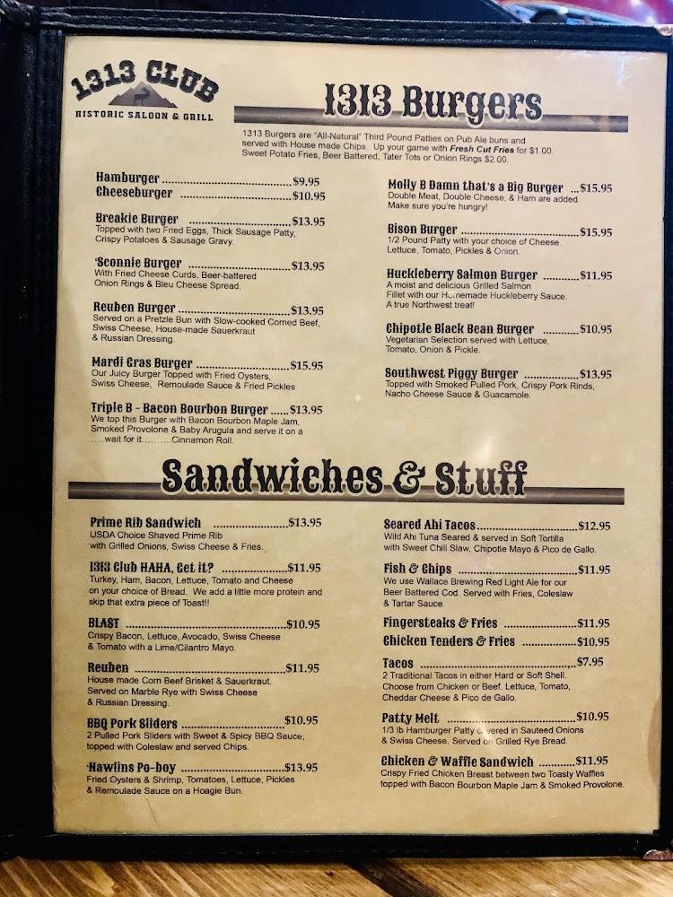 Welcome to the 1313 Club, a historic saloon nestled in the heart of Wallace, ID. Experience a delightful blend of great food and handcrafted cocktails in a relaxed atmosphere filled with character. Whether you’re stopping by for a casual lunch, dinner, or a night out with friends, our menu offers a variety of delicious options, including local specialties, craft beers, and an extensive wine selection. Enjoy live concerts and sports events while soaking up the unique charm of our space. With accessible amenities and a vibrant ambiance, 1313 Club is the perfect destination for any occasion. Visit us at 608 Bank St!
